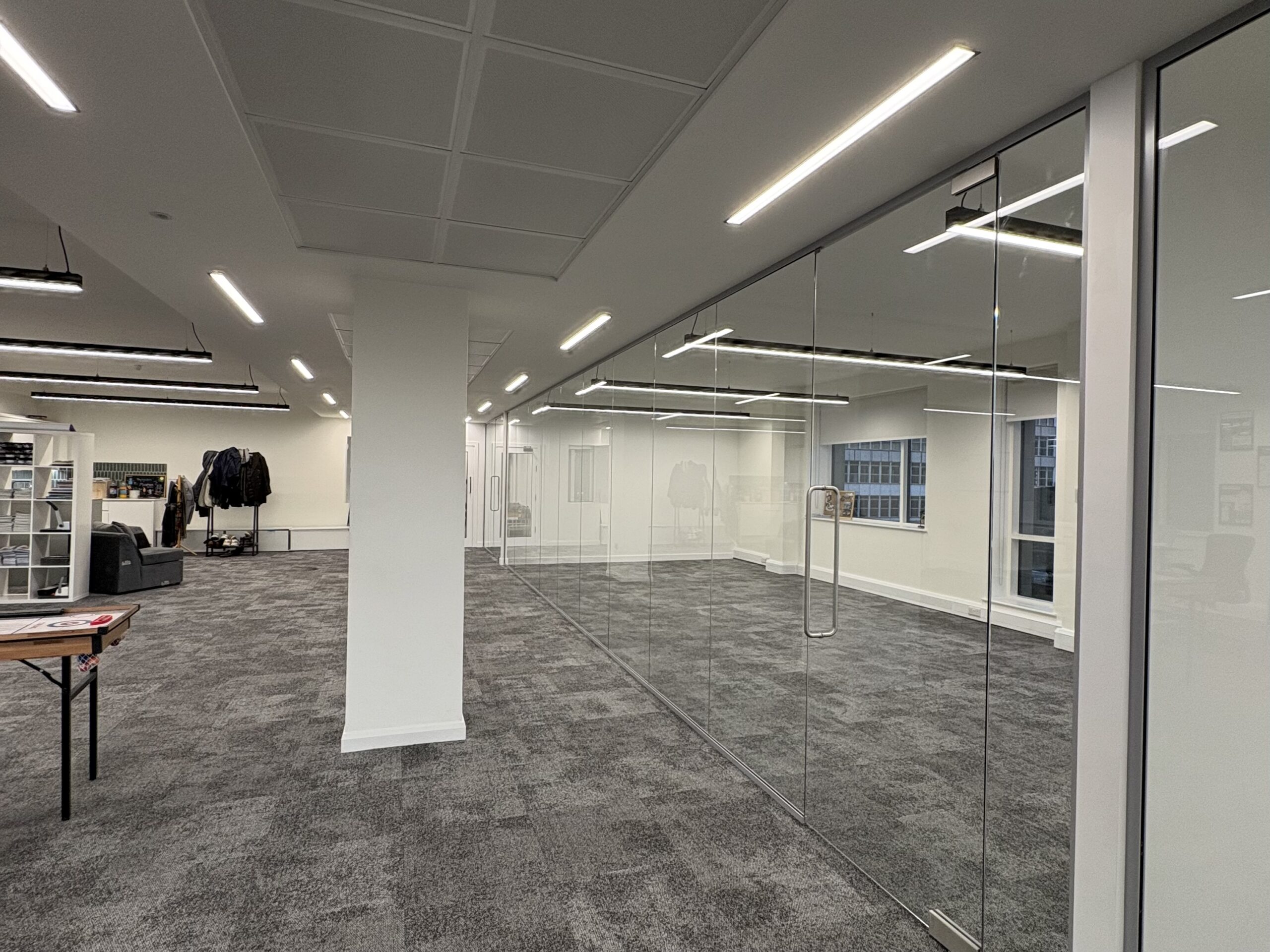 We executed a comprehensive office transformation, starting with the installation of high-performance metal stud partitions to define the core office areas. We then needed to provide the necessary privacy for the executive meeting rooms without closing off the office. For this purpose and to maintain a sense of space and light, we integrated the frameless glass partitions. We also installed a modern suspended ceiling system throughout, incorporating premium insulation to ensure the workspace remained energy-efficient and acoustically sound. Finally, we carried out a meticulous tape and fill finish process. This left the walls perfectly smooth and ready for the final brand-specific decoration.
